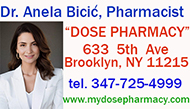 “DOSE PHARMACY“: VAŠE ZDRAVLJE – NAŠ PRIORITET Dobro došli u ”DOSE PHARMACY”, 633 5th Ave, Brooklyn, NY 11215 U ”DOSE PHARMACY” nudimo pouzdanu stručnost, sa ljubaznom uslugom, kako bismo vam pružili sve što vam je potrebno za bolje zdravlje. USLUGE: Izdavanje ljekova - brzo, tačno i pouzdano, vakcinacija protiv gripa, imunizacija djece, mjerenje krvnog pritiska i glukoze. Besplatni stručni savjeti i konsultacije - Naši farmaceuti su uvjek tu da vam pomognu. Mi prihvatamo sve vrste osiguranja: Medicare, Medicaid, Optum, United Healthcare, EmblemHealth, Healthfirst, CVS Caremark, Humana, Blue Cross Blue Sheild, Anthem, Metroplus, Medco, Cigna, Metro Plus, Express Scripts, Fedelis, Aetna, Med Impact, OTC Benefits. Besplatna dostava - Dobijate diskretno svoje lekove na kućnu adresu Posjetite nas već danas na: Dr. Anela Bicić, Pharmacist “DOSE PHARMACY” 633 5th Ave, Brooklyn, NY 11215 tel. 347-725-4999 www.mydosepharmacy.com
